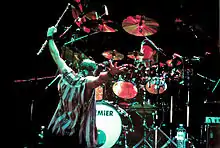 Anderson became annoyed with music critics who described Aqualung as a concept album, which he had not intended it to be. "I always said at the time, this is not a concept album. It's an album of varied songs ... in which three or four are kind of the keynote pieces for the album, but [that] doesn't make it a concept album."[73] He decided to "come up with something that really is the mother of all concept albums" in response.[74] Influenced by the style of Monty Python, he wrote a suite that combined complex musical ideas with offbeat humour and made fun of the band, its audience and its critics.[75] This album, released in 1972 as Thick as a Brick, consisted of a single continuous piece of music running for 43 minutes, spread over two sides of vinyl, an uncommon format for rock albums.[76] It was written and recorded in stages, the whole band helping with arrangements,[77] and was co-credited to a fictional schoolboy, Gerald Bostock.[74] Thick as a Brick became the first Tull album to reach number one on the (US) Billboard Pop Albums chart.[78] The following year's A Passion Play was the only other album by the band to do so.[79]