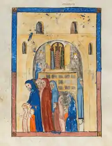 Synagogue in Catalonia. Sarajevo Haggadah, Barcelona ca. 1350.