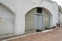 This structure is recessed into the earth and features concrete outer retaining walls, a concrete roof fitted with six steel vents and a commanding red brick facade addressing the sunken pathway, the west and a small machine gun emplacement. Done in Old English bond, this wall face is about five metres along its highest section connected to sloping side wings also constructed of brick. Three arched openings in this facade, about four metres wide, have been variously in-filled; two with concrete and a central strip of steel containing single steel doors and the last with steel partitioning and a central steel door. Above the archways are small circular openings that have been in-filled. Inside are three barrel-vaulted underground rooms or bays, the thick separating walls of which are brick and feature a number of doorways. The larger two rooms were for storage and measured about 8.5 by 5.5 metres (28 ft × 18 ft) in plan and 3 metres (9.8 ft) high. The telephone room measures about 3.65 by 3 metres (12.0 ft × 9.8 ft) and almost 2.8 metres (9 ft 2 in) at the highest line of the vault. New quarry tile flooring has been installed throughout and all other interior surfaces have been painted sometime after 1997.[1]