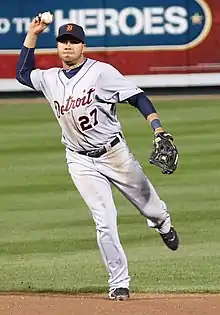 Ten days after hitting his first inside-the-park-home-run against the Tigers, the Indians traded Peralta to the Tigers for minor league pitcher Giovanni Soto and cash considerations.[11] Because the club had already retired the number 2 – Peralta's uniform number as an Indian – in honor of Hall of Famer Charlie Gehringer, he chose the number 27 instead.[12] On July 30, Peralta hit a home run in his first plate appearance (PA) as a Tiger, and then, another, two plate appearances later.[13] After joining the Tigers, he returned to primarily playing shortstop. He made 46 appearances shortstop, nine at third base, four at designated hitter and two at first base for the remainder of the 2010 season.