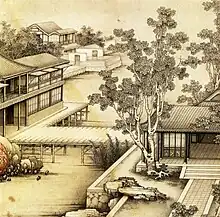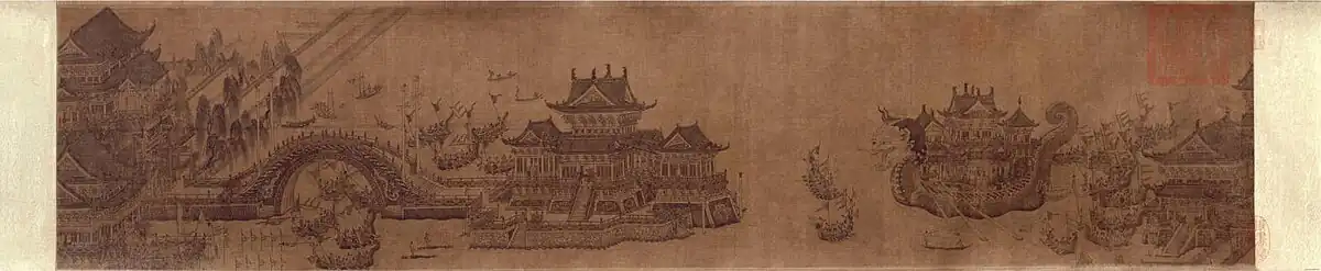 Court patronage for jiehua peaked in the Northern Song period, resulting in the creation of some of the greatest jiehua masterpieces of all time, such as Along the River During Qingming Festival 《清明上河图》.[28] Historian Wen Chien-Cheng suggests that the renaissance of jiehua painting in the Northern Song Dynasty may be attributed to the rising prominence of landscape paintings and appreciation of realism.[28][29] The surviving jiehua works from the Southern Song period typically portray close-ups of structures which were “often juxtaposed with voids that suggest distance and atmospheric mood," an adoption of Southern literati landscape features.[30]