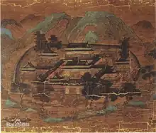 During the Wei, Jin, Northern and Southern dynasties, the artistic scope of jiehua expanded beyond technical architectural drawings to also incorporate scenery and environments. Although surviving works from this period are few, many names of jiehua painters were recorded and For instance, the painter Yang Xiushan 杨修善 from the Cao Wei court created a landmark jiehua work called the Two Capitals 《两京图》 which depicted the splendor of the dual capitals of Luoyang and Chang'an.[23] Notably, alongside secular structures, Buddhist temple architecture emerged as a prominent subject in jiehua during this period, coinciding with the rapid spread of Buddhism. Craftsmen like Jiang Shaoyou 蒋少游, possessing expertise in architecture and engineering due to their professional backgrounds, also joined the ranks of jiehua painters.[23] This integration of specialized architectural knowledge into the realm of jiehua represents a significant and pivotal development in the evolution of the art form. Yet despite such advancements, it was also during this period that the earliest records emerge of jiehua being viewed as an inferior art form, with Eastern Jin scholar Gu Kaizhi 顧愷之 ranking it as the lowest form, a classification that laid the groundwork for a tradition of disdain towards jiehua by literati circles throughout the rest of history.[24]