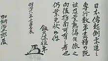 After Iso died in 1881, Kanō began training in Kitō-ryū with Iikubo Tsunetoshi (Kōnen). Iikubo was an expert in kata and throwing, and fond of randori. Kanō applied himself thoroughly to learning Kitō-ryū, believing Iikubo's throwing techniques in particular to be better than in the schools he had previously studied.[12][13] It is Iikubo who issued Kanō a documented jūjutsu rank and teaching credential, namely a certificate of menkyo (not menkyo kaiden) in Nihonden Kitō Jūdō, dated October 1883.[19]