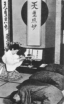 At this time, somewhere between ten and thirty followers would live in the same house as Nagaoka, though not all members lived with her.[18] Nagaoka's leadership saw a religious focus on her oracles, performed through spirit-writing, which became the infallible authority of Jiu.[19][20] Not only did the oracles set out the details of the world renewal process and post-world renewal society under the kami, but also the day-to-day activities of her followers, leadership roles and financial decisions.[21] One such oracle, performed on 22 June, delivered the word Jikō (璽光). Thereafter, her followers referred to Nagaoka as Jikōson.[22] They also prayed for the return of Amaterasu to deliver the world from chaos, while financially surviving on donations from followers and benefactors.[23]