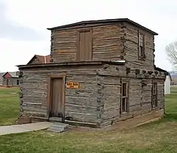 The Jim Baker Cabin was built in 1873 by frontiersman Jim Baker as a fortified house on the Little Snake River at Savery Creek near present-day Savery, Wyoming. The two-story log building measures 31 feet (9.4 m) by 16 feet (4.9 m) with two rooms on the lower level and a single smaller room on the upper level. The outer walls are made of logs 12 inches (30 cm) to 15 inches (38 cm) thick.[2]