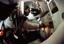 Aldrin performed three EVAs. The first was a standup EVA on November 12, in which the spacecraft door was opened and he stood up, but did not leave the spacecraft. The standup EVA mimicked some of the actions he would do during his free-flight EVA, so he could compare the effort expended between the two. It set an EVA record of two hours and twenty minutes. The next day Aldrin performed his free-flight EVA. He climbed across the newly installed hand-holds to the Agena and installed the cable needed for the gravity-gradient stabilization experiment. He performed several tasks, including installing electrical connectors and testing tools that would be needed for Apollo. The EVA concluded after two hours and six minutes.[61][62] Before returning to the spacecraft, Aldrin cleaned the pilot's window with a cloth, and Lovell jokingly asked him if he could change the oil too.[63] A third, 55-minute standup EVA was conducted on November 14, during which Aldrin took photographs, conducted experiments, and discarded some unneeded items.[61][62][64]