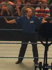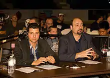 Korderas (right) and Arda Ocal ringside doing commentary at an independent wrestling show in 2012