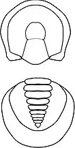Like all Weymouthiidae, Jinghediscus lacks eyes and facial sutures. Cephalon semi-elliptical. Glabella has one transglabellar furrow and inflated posterior lobe that widens towards rear. Preglabellar field broad (sag.) and confluent with uniformly wide (tr.) genal areas. Occipital ring (L0) ill-defined and without spine. cephalic border is only gently convex and of uniform width. Pygidium with strongly conical axis composed of ten axial rings; pleural fields smooth and defined from axis merely by a change in slope. Pygidial border broadens considerably towards rear and is wider (sag.) posteriorly than width (tr.) of the smooth pleural fields.[4]