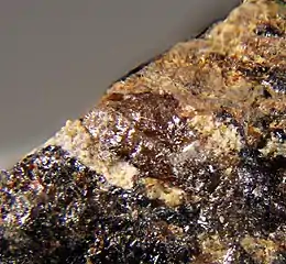 Jinshajiangite is a rare silicate mineral named after the Jinshajiang river in China.[4][3] Its currently accepted formula is BaNaFe4Ti2(Si2O7)2O2(OH)2F.[5] It gives a name of the jinshajiangite group.[3] The mineral is associated with alkaline rocks. In jinshajiangite, there is a potassium-to-barium, calcium-to-sodium, manganese-to-iron and iron-to-titanium diadochy substitution. Jinshajiangite is the iron-analogue of surkhobite[5] and perraultite.[6] It is chemically related to bafertisite, cámaraite[3] and emmerichite.[7] Its structure is related to that of bafertisite. Jinshajiangite is a titanosilicate with heteropolyhedral HOH layers, where the H-layer is a mixed tetrahedral-octahedral layer, and the O-layer is simply octahedral.[5]