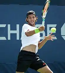 In July, Sousa reached his second-career ATP tour level final and his first of 2014 at the Swedish Open, defeating the defending champion Carlos Berlocq in the semifinals.[123] He lost the final to the Uruguayan Pablo Cuevas in straight sets.[124] After losing in early rounds at the German Open and the Croatia Open,[125][126] Sousa entered the Canada Masters, where he was defeated in the first round by 11th seed Gulbis.[127] At the Cincinnati Masters, Sousa was defeated by Andy Murray in the second round.[128] Sousa was also eliminated in the second round of the Winston-Salem Open.[129] At that tournament's doubles competition, Sousa reach his third semifinal of the season, teaming up with Romanian Florin Mergea.[130] At the 2014 US Open, Sousa became the first Portuguese player to be seeded at a Grand Slam tournament, with the 32nd seed at the singles competition.[23] He started with a five-set win over Canadian Frank Dancevic.[131] In the second round, he lost to David Goffin.[132] In the doubles competition, Sousa partnered with Serbian Dušan Lajović and beat the Americans Marcos Giron and Kevin King in the first round.[133] They eventually fell to 4th seed Marcelo Melo and Ivan Dodig in the second round.[134]