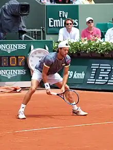 Sousa returned in April at the Monte-Carlo Masters, losing in the second round to Milos Raonic.[161] At the Barcelona Open and Estoril Open, he lost in early rounds and then was eliminated from the Madrid Masters in the second round by Stan Wawrinka and from the Rome Masters in the first round by John Isner.[162][163][164][165] At the Geneva Open, Sousa won a first round match over his Brazilian homophone João Souza, which was notable for the umpire needing to refer to each player by their nationality to distinguish between them during the calls.[166] Sousa proceeded to the final, his first of the season, where he lost to Thomaz Bellucci.[167] At the French Open, Sousa beat Canadian Vasek Pospisil in straight sets in the first round,[168] and was defeated by 3rd seed Andy Murray in the second round.[169] In the men's doubles of the tournament, Sousa partnered with Bellucci and was knocked out in the first round by 11th seeds Jamie Murray and John Peers.[170] In June, Sousa did not have a strong grass court season; he was defeated in the early rounds at the Rosmalen Grass Court Championships, the Queen's Club Championships and the Nottingham Open.[171][172][173] At Wimbledon, Sousa was again eliminated in straight sets in the first round by French Open champion and 4th seed Stan Wawrinka.[174] His results did not improve in the men's doubles competition, from which he was eliminated in the first round while partnering with Santiago Giraldo.[175]