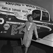 Smith's trip around the world began and ended in Oakland, California. She flew a twin-engine Piper Apache with the call sign N3251P ("51-Papa"), which she dubbed City of Long Beach in recognition of the city's sponsorship of her expedition.[1][2] Leaving on March 17, 1964, she first followed the route Amelia Earhart and Fred Noonan had taken in 1937: across the southern United States, across the Caribbean to follow the northeast coast of South America, across the Atlantic Ocean to West Africa, across Africa and along the south coast of Asia, to Australia and New Guinea.[2] She stopped at all the same way points as Earhart (except for Yangon in Myanmar, which had recently experienced a military coup).[1] In New Guinea, she met with several people who had witnessed Earhart and Noonan's departure, apparently the last to see them.[1] She also visited Saipan to investigate speculation about Earhart's possible fate there. She then flew across the Pacific Ocean via Wake and Midway Islands and Hawaii, and completed the trip on May 12, 1964, a trip of 27,750 miles and 56 days.[1][2] (Mock had begun her trip two days after Smith, but completed it on April 17.)