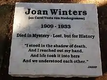 Joan Winters (December 8, 1909 – October 1933) was a Broadway dancer who was murdered in the Garden of Gethsemane, outside Jerusalem, in 1933.[1][2][3] Although her birth name was Carol Vesta von Niedergesaess, her father changed the family surname to Godfrey during World War I, so for most of her life she was known as Carol Godfrey. She was born in Seattle, Washington, where she lived with her family until 1928.[4]