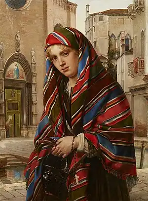 Cuadras was represented at the Royal Academy in 1872 by his painting Mulatto Girl's Toilette, a Scene in Cuba[4] (sold at Sotheby's, New York in 2010[5]) and the following year he contributed two engravings The Cuban Lovers and The Mulatto Girl to The Graphic magazine.[6] In 1874, he exhibited Return the Christening, a painting of a scene in Venice with a christening party landing from a gondola, at the International Exhibition of Fine Arts in London.[7][8] This painting is currently in the collection of The General Hospital, Jersey.