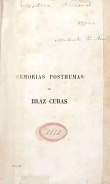 He wrote five romantic novels: Ressurreição, A Mão e a Luva, Helena and Iaiá Garcia.[16] The books were a success with the public, but literary critics considered them mediocre.[16] Machado suffered repeated attacks of epilepsy, apparently related to hearing of the death of his old friend José de Alencar. He was left melancholic, pessimistic and fixed on death.[17] His next book, marked by "a skeptical and realistic tone": Memórias Póstumas de Brás Cubas (Posthumous Memoirs of Brás Cubas, also translated as Epitaph of a Small Winner), is widely considered a masterpiece.[18] By the end of the 1880s, Machado had gained wide renown as a writer.[8]