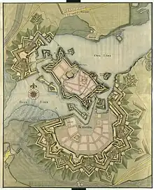 In 1684 he would begin expanding Rendsburg's fortified works south. Here he established the new citadel Nyværk. This defensive complex was built in the typical modern style of the age of Vauban, sporting a grand central parade ground with radial streets emanating from it. Those streets lead out to the walls of the polygon-shaped citadel.[13] This citadel had six bastions, as well as ravelins and other outer defensive barriers. Nyværk itself was larger than the entirety of Rendsburg's old fortifications, and stretching south it went beyond the borders of Schleswig and down into Holstein. Between 1690 and 1695 Scholten furthermore expanded the city's fortifications north with the new Kronværk, placing it where a small village on the northern Eider bank had lied previously.[11] The Kronværk was smaller than the Nyværk, and it also had both ravelins and other defensive works guarding its walls. Scholten made Rendsburg into the most modern fortress in the realm, and the only other fortress classed as 'first class' other than Copenhagen.[14]