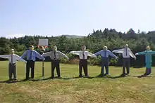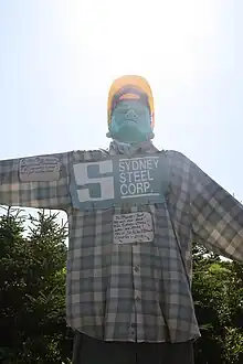 Joe's Scarecrow Village was a collection of scarecrows located in a field beside the Cabot Trail, a Cape Breton highway with a high volume of tourists. The scarecrows were dressed in a variety of costumes, including those of fisherman, a wedding party, school children, celebrities, and politicians.[3] Joe Delaney, the attraction's creator, described the costumes as being similar to those traditionally worn by local Acadians for mi-carême festivities.[4] The scarecrows were labelled with names and descriptions, with some of the scarecrows being memorials to local people.[5] The Village featured a souvenir shop and snack bar. The attraction did not charge admission but accepted donations for the ongoing maintenance of the project. As a novel tourist site, Delaney was given an innovation award by the Cape Breton Tourist Association, and an honor roll award by the Tourist Industry Association of Nova Scotia.[6]