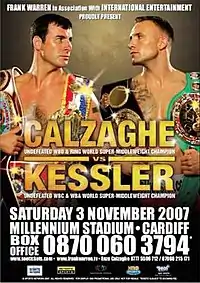Joe Calzaghe versus Mikkel Kessler was a super middleweight boxing contest between the number one and two super middleweights in the World. At the time both fighters were unbeaten. On the line was the WBA (Undisputed), WBC, WBO, and The Ring championship.[1] Calzaghe won by unanimous decision.