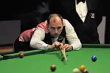 Perry's good play continued into 2014 as he advanced to the quarter-finals of the German Masters with the loss of just three frames, but he then lost 2–5 to Ding Junhui.[22] He secured an impressive 5–1 win over Selby in the quarter-finals of the Welsh Open, stating that his newfound casual approach to the game was a key reason for his successful season.[25] However, it was Ding who once again halted his run in a ranking event as he beat Perry 6–4.[26] A sixth quarter-final appearance of the season came at the PTC Finals, but he lost 2–4 to Judd Trump.[22] He fought back from 3–6 down after the opening session of his first round match with Jamie Burnett at the World Championship to win 10–7 and set up a second round clash with reigning champion Ronnie O'Sullivan.[27] Perry started the better of the two as he established a 5–3 lead after the opening session and maintained his two-frame advantage after the second, although he missed a chance in the final frame to be 10–6 ahead.[28] He went on to lead 11–9, before O'Sullivan leveled the match and then made back-to-back century breaks to win 13–11, with Perry remarking afterwards that he had been "blown away by a genius" in the last few frames.[29]