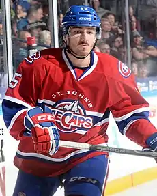 On July 1, 2015, Hanley signed a one-year, two-way contract with the Montreal Canadiens.[3] He began the 2015–16 season with the Canadiens' affiliate, the St. John's IceCaps. On March 20, 2016, the Canadiens recalled him.[4] He made his NHL debut that evening in a 4–1 loss to the Calgary Flames.[5] Two nights later, he recorded his first two career NHL points with two assists in a 4–3 win over the Anaheim Ducks.[6] He finished the season with six assists in ten games for the Canadiens, and 13 points in 64 games for the IceCaps.