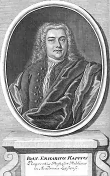 Johann Erhard Kapp was born in Oberkotzau, a small market town in the hill country between Leipzig and Nuremberg. His father was a carter ("Fuhrmann"). In 1796 he enrolled at the secondary school ("Gymnasium") in Hof, a couple of hours to the north of Oberkotzau. However, according to at least one source he was removed from the school after six months and instead taught privately.[3] In 1714 he moved away from home to study at Leipzig, where he would make his career.[1] Among his more noteworthy teachers, Christian Friedrich Börner (1663-1753) taught him Biblical Exegesis and aspects of Church History. Johann Gottlob Carpzov (1679-1767) introduced him to New Testament scholarship. In an age before university libraries had become mainstream, another Leipzig scholar, Johann Burckhardt Mencke, provided valuable support by allowing Kapp access to his extensive personal library.[4] The denominational context in the Leipzig Theological faculty was by this time one of Lutheran orthodoxy.[4]