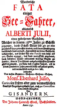 - Wunderliche Fata einiger Seefahrer, absonderlich Alberti Julii, eines geborenen Sachsens, welcher in seinem 18den Jahre zu Schiffe gegangen, durch Schiff-Bruch selb 4te an eine grausame Klipe geworffen worden, nach deren Übersteigung das schönste Land entdeckt, sich daselbst mit seiner Gefährtin verheyrathet, aus solcher Ehe eine Familie mit mehr als 300 Seelen erzeuget, das Land vortrefflich angebauet, durch besondere Zufälle erstaunens-würdige Schätze gesammlet, seine in Teutschland ausgekundschafften Freunde glücklich gemacht, am Ende des 1728sten Jahres, als in seinem Hunderten Jahre, annoch frisch und gesund gelebt, und vermuthlich noch zu dato lebt, entworffen Von dessen Bruders-Sohnes-Sohnes-Sohne, Mons. Eberhard Julio, Curieusen Lesern aber zum vermuthlichen Gemüths-Vergnügen ausgefertiget, auch par Commission dem Drucke übergeben Von Gisandern.