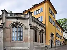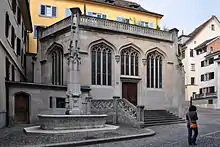 Unfortunately, many of Breitinger's Zürich buildings no longer exist. One that survived in the heart of the city, thanks to a referendum conducted in response to a contentious redevelopment plans in the 1960s, which has more recently been imaginatively and carefully restored, is the "Great Minster Chapel",[7] built between 1858 and 1860, across the Zwingliplatz beyond the Theological Faculty in the former cloisters of the "Great Minster", in the "Old town". The chapel applies a Swiss vision the so-called English Tudor Gothic style, with a large fountain on the west side of the building. Breitinger achieved significant additional interior floor space by using a polygonal floor plan which pushes through, far into the adjacent pre-existing "helper building". Fountain and chapel are both part of a more ambitious (otherwise unrealised) plan that Breitinger had drawn up in 1858 for a renovation of the Medieval "Helferei Quarter".[1][8]