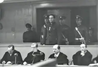 ![]() Schwarzhuber listens to his death sentence being read out at the Ravensbrück trial | |