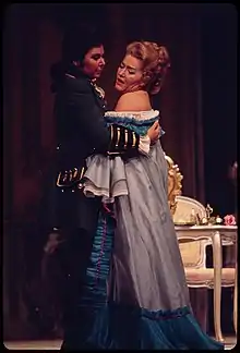 Meier's debut at the Metropolitan Opera came earlier than planned: she had been scheduled to debut in December 1976, playing Marguerite in Faust, but was sent onstage in April as a last-minute replacement for Montserrat Caballé as Ariadne in Ariadne auf Naxos.[2][6] During her fourteen years at the Met, she played fifteen roles, including Chrysothemis, Senta, Leonore, the Empress, the Marschallin, Elisabeth, Ellen Orford, Donna Anna, Tosca, Sieglinde, Brünnhilde and Isolde.[2] Especially her interpretation of Wagner's Liebestod is a miracle of subtlety. Meier was seen in the title role of Vanessa (with Christopher Keene conducting), when it was televised from the Spoleto Festival USA, in 1978. She began her stint at Bayreuth in 1981 in the widely praised production of Tristan und Isolde by Jean-Pierre Ponnelle (q.v.); this production was eventually recorded on video.[2] Her final professional performance, in 1994, was as Elektra.[5]