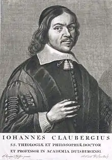 Johannes Clauberg (24 February 1622 – 31 January 1665) was a German theologian and philosopher. Clauberg was the founding Rector of the first University of Duisburg, where he taught from 1655 to 1665. He is known as a "scholastic cartesian".