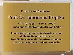 Tropfke was born in Berlin at Marienstraße 14 as the older of two sons of the cabinet maker Franz Tropfke. The house in which Tropfke was born was built by his grandfather Franz Joseph Tropfke around 1830 and is one of the few houses in the area that was not destroyed during World War II. Tropfke grew up in Berlin and after his graduation from the Friedrichs-Gymnasium (high school) in 1884 he attended the university in Berlin to study sciences and mathematics. In 1889 he was awarded a degree to teach math and sciences at gymnasiums (high schools). Later he earned a PhD in mathematics from the University of Halle for a thesis on elliptic integrals (Zur Darstellung des elliptischen Integrales erster Gattung), his advisor was Lazarus Fuchs.[1][2]