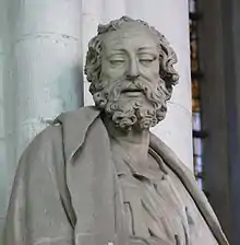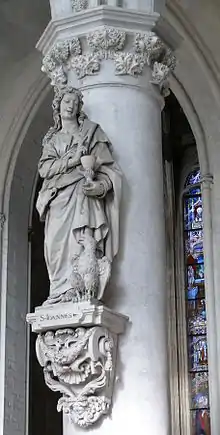 Despite the baroque nature of his architectural work, his figure sculpture did follow the non-dynamic forms of the Renaissance style. His image of Saint Gummarus for the baroque altar erected in 1620 in the St. Gummarus Church in Lier is heavy in proportions, unrealistic in detail and static in its pose. Later works such as the marble statue of the apostle Simon in 1638 in the St. Rumbold's Cathedral in Mechelen are, however, livelier and realistic.[2] This is also true for sculptures made after designs by Rubens such as the image of St. Michael fighting with the devil, made for the church of the abbey of St. Michael in Antwerp and now in the St. Trudo Church in Zundert.[9][10]