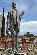 The mineral water made Carlsbad world famous for many years until the Great Depression, and because of lack of maintenance, the wells broke down. The wells needed repair and, lacking the funds, they were lost for sixty years. In 1993, restoration of the well was begun by Ludvik Grigoras, a native of Karlovy Vary, Czech Republic, the sister-city of Carlsbad. He also re-drilled another of Frazier's wells which turned out to be naturally carbonated. Ludvik encouraged renowned Czech sculptor Vaclav Lokvenc to create a 13-foot bronze statue of Frazier which was shipped from Europe in 1994 and was erected at the historical site.[13] The mineral springs was reopened after 110 years during a ceremony on 24 July 1994. Today the famous therapeutic water is being bottled again as Carlsbad Alkaline Water. A spa can be found in the European-style building at Alt Karlsbad, a replica of a German Hanseatic house, located on Carlsbad Boulevard.[14]