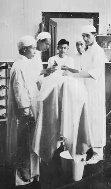 The hospital consisted of a two-story outpatient clinic and a three-story main hospital. The design was primarily Western, although the outpatient wing was still built in a Chinese style, connected to the main hospital through a covered gallery.[17] It was fireproof, and included a rooftop garden, new machines, an X-ray suite, a sterilizing room, a pharmacy, religious offices, electricity, and air conditioning in 2 new well-lit operating rooms, along with other modern features.[2] Four new hospital staff residences were constructed, and nurse's quarters were added in order to improve the nursing school for native women.[18] Additionally, administration obtained a new X-ray machine which greatly improved the hospital's ability for diagnosis.[10]
