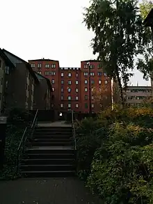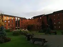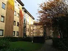 Garnett Hall lies in the north easternmost section of the accommodation area. Its three blocks have a very similar design to that of Forbes hall.[7] It provides accommodation for 124 students in 4 – 6 person flats. The origin of the name is that of Thomas Garnett, a lecturer of physics and also very committed to the educational emancipation of women[8]