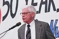 By the end of the campaign, much of Anderson's support came from college students.[6] He capitalized on that by becoming a visiting professor at a series of universities: Stanford University, University of Southern California, Duke University, University of Illinois College of Law, Brandeis University, Bryn Mawr College, Oregon State University, University of Massachusetts Amherst, and Nova Southeastern University and delivered the lecture at the 1988 Waldo Family Lecture Series on International Relations at Old Dominion University.[66] In 1984, Anderson endorsed Walter Mondale over Ronald Reagan in the presidential election.[67] He was chair of FairVote from 1996 to 2008, after helping to found the organization in 1992, and continued to serve on its board until 2014. He also served as president of the World Federalist Association and on the advisory board of Public Campaign and the Electronic Privacy Information Center, and was of counsel to the Washington, D.C.-based law firm of Greenberg & Lieberman, LLC.[68]