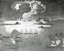 Benbow's experience led to him being promoted to a similar flotilla, this time to be deployed against Dunkirk under the command of Vice-Admiral Shovell. A number of converted merchant vessels, rigged like fireships but designed to explode rather than burn, were assigned to support the expedition.[9] Benbow had a hand in preparing these vessels for the operation throughout 1694, and worked closely with the principal storekeeper of the ordnance, Willem Meesters.[26][27] Benbow's attacking fleet was covered by Shovell's fleet on the Downs and the attack was planned for 12 and 13 September.[27] However, the French were able to block the entrance to the port, preventing Benbow's squadron from entering, and a storm further disrupted operations.[27] Benbow drew back from Dunkirk, and instead sailed around to Calais, where he carried out a further bombardment on 27 September. He returned to the Downs and then resumed his duties at Deptford Dockyard. He spent December organising a convoy for a fleet of merchant vessels due to sail to Cadiz.[20]