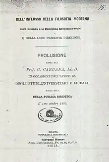Intellectually, liberalism was what seemed to preoccupy Caruana most. Amongst his various works, one is noteworthy for its philosophical value. It is Dell’Influsso della Filosofia Moderna (On the Influence of Modern Philosophy).[3] This 28-page booklet in Italian was published in Malta in 1889 (Tipografia Industriale di Giov. Muscat, Salita Guardanmangia, Pietà). The title is augmented with the qualification sulla Scienza e le Discipline Economico-sociali e della loro presente direzione (on Science and the Economic-Social Disciplines, and their present direction).
