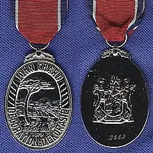The John Chard Decoration, post-nominal letters JCD, was a military long service decoration which was instituted by the Union of South Africa on 6 April 1952. It was awarded to members of the Citizen Force of the South African Defence Force for twenty years of efficient service and good conduct. Clasps could be awarded after thirty and forty years service respectively.[1][2][3]