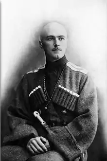 Dombrovsky was born into an aristocratic family of Szlachta descent to parents Gratian-Ignatius Dombrovsky and Youzefa Dombrovsky (née Brezinska).[1] He received a classical education and graduated from the St. Vladimir University (University of Kyiv) in 1913 with a degree in law. At some point during or shortly after his studies he married his first wife, Ebrenia (a.k.a. Catherine) Ignatevnia Makavelia, and had two children, Cyril and Maria.[2] He went on to serve as a cavalry officer under Czar Nicholas II during World War I in the Circassian Regiment of the Russian Imperial army. For his efforts in the war, he earned the Saint George's Cross.