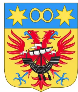 The main field of Professor Donaldson's coat of arms is tinctured Or and shows a MacDonald Gules eagle and a Sable boat both symbolising his Scottish ancestry. The Chief field is Azure and shows two gold Commonwealth Stars from the arms of Australia, and a gold infinity symbol in between, symbolising his career in Australia as a mathematician. Above the shield is placed a barred helmet topped with a red rampant lion, which is turned outward. The lion derives from the arms of Scotland and also from the arms of Tasmania and Hobart.[14]