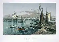 From 1872 to 1873, he travelled extensively as one of the primary illustrators for D. Appleton & Company's series Picturesque America,[9][10] whose many engravings were based on sketches or watercolor paintings done on site. Woodward's drawings and paintings illustrated the sections on "Mackinac",[11] the "South Shore of Lake Erie",[12] the "Valley of the Connecticut",[13] "Boston",[14] the "Valley of the Housatonic",[15] the "Valley of the Genesee",[16] the "Eastern Shore",[17] "Lake Memphremagog",[18] "The Upper Delaware",[19] and the "Water-falls at Cayuga Lake".[20] His Connecticut Valley, from Mount Tom;[21] Boston, from South Boston;[7] and Quebec[22] were the basis for three of its steel engravings. The work was a major influence on the growth of American tourism and on its conservation and preservation movements.[23] It was massively popular and sold more than 100 000 copies by 1880.[23] During this period, Woodward also met and befriended Harry Fenn, another important illustrator on the project, despite the two working in different areas of the country.[24]