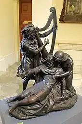 In Y Gaer, a metal electrotype of his 1848 plaster sculpture, Death of Tewdrig, depicts the dying fifth-century king Tewdrig and saint of Glamorgan. It was designed by Thomas and modelled by his brother W. Meredyth Thomas in response to a patriotic competition at the 1848 Abergavenny Eisteddfod.[9][10] This was shown again at the Royal Academy in 1849, and again as an electrotype at the Great Exhibition of 1851.[4] This sculpture is associated with the Welsh national revival of the 1830s and 1840s.[4]