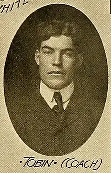 John Frederick Tobin (January 1, 1880 – October 26, 1954) was an American college football player and coach. Tobin attended the University of Chicago, where he played college football under head coach Amos Alonzo Stagg. He was a "star guard" for the Maroons during the 1904 season.[2] In 1905, he served as head coach at Tulane University alongside assistant Harry Ludlow for the 1905 season. Tulane lost its only game, 5–0, that year.[3] Tulane accused its opponent, LSU, of using ineligible players, and the disagreement resulted in a hiatus of the series until 1911.[4] In October, he returned to play for the Chicago team.[2] In December 1905, he accepted the position of athletic director at Tulane.[5] Tobin graduated from Chicago in June 1906, and passed the Illinois bar examination. He was a member of the Delta Chi fraternity. In 1906, he intended to begin practicing law after coaching at the University of Utah during the upcoming season.[6] He later worked as a judge in Utah.[7] Tobin died of a heart attack on October 26, 1954, in Salt Lake City, Utah.[8]
