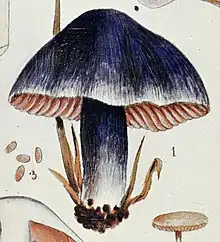 In 1948, the 1904 description of Entoloma farrahi by George Edward Massee and Charles Crossland was re-examined, and was judged to be dubious, on account of not being an Entoloma due to the given smooth shape of the spores.[34] The spore size (to 10.8 µm in length),[35] if assumed to be correct even if the shape is wrong, would only fit E. bloxamii. However, the fruit body which Farrah found in 1903 would closely resemble the endangered Entoloma species: big blue pinkgill, specifically E. atromadidum whose indigo colour (shading to black) is identical, if the 1904 drawing of the smooth spores were taken as an error.[34][36][37][nb 18]