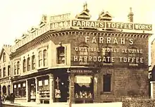One Joseph Farrah of Harrogate was selling "genuine spaw water" and exporting it as far as Hull in 1822.[21] Robert Hudson Swan started a tea business in Crown Place, Harrogate.[1][2] In 1840 Swan invented a toffee recipe designed to take away the taste of the Harrogate spa waters which tourists would take at the nearby Royal Pump Room. The taste of this toffee is like barley sugar and butterscotch, and it contains various types of sugar, butter and lemon flavouring.[22] Farrah's paternal grandmother Ann Farrah was a relative of Swan and an assistant in the business, and his father Joseph was registered as a dealer for the company in 1848. The company was officially registered at 2 Crescent Place, Harrogate in 1873. By 1887 John Farrah was owner of the company, and in that year he registered Swan's recipe as Farrah's Harrogate Toffee, while trademarking his own name as the business name. However the company was not listed with directorships until 16 February 1897, when John Farrah Limited was registered; the directors were Fred Farrah Ridsdale, Fred Hunter and John Farrah. John Farrah resigned on 26 March 1900 at the age of 50.[1][23]