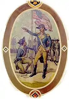That Autumn 1782, Hamtramck's company was at full strength, and ordered to the Peekskills to establish a screen against possible British movements.[55] They spent that Winter at New Windsor, New York.[56] He completed his final muster and dismissed his company on 21 May 1783.[57] Without a home in the United States, Hamtramck remained at New Windsor, and unsuccessfully petitioned to remain in the Army.[58] Hamtramck served until 3 June 1783. He was brevet promoted to major at the time of his discharge.[3] That same year, he was among the original members of the New York State Society of the Cincinnati.[59]
