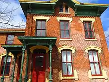 In 1873 Ott started building the house that is the subject of this article, on the Jenifer Street side of the lot where his store was. The house is in High Victorian Italianate style, with walls made of brick that may have come from Ott's own brickyard. The windows are framed in ornate sandstone sills and lintels. A line of brick corbels runs beneath a wooden cornice and eaves. In the front center the straight eaves are interrupted by a curved dormer which shelters two tombstone-shaped windows. The roof is shallow and hipped, and was originally topped with a cupola. Wings and bays flank the central block. The High Victorian subtype of Italianate that this house represents is unusual in Madison, where most other Italianate houses are of the Italian Villa or the square-massed subtypes.[2]