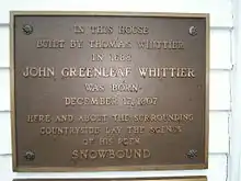 The future poet John Greenleaf Whittier was born in December 1807[2] in the southwest parlor of the farm house, which today remains essentially the same as it was in that year. Growing up, Whittier lived the hard-working life of a farm boy. Amid strenuous labor, he suffered chronic headaches and fatigue and attended Quaker meetings or school infrequently.[2] He also learned he was color-blind when he was unable to differentiate between ripe and unripe strawberries.[3]