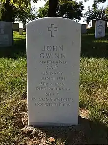 As Captain of USS Constitution, Gwinn sailed on December 9, 1848 and arrived at Tripoli on January 19, 1849. While transporting U.S. ambassador Daniel Smith McCauley and his family to Egypt, McCauley's wife gave birth to a son, who was named Constitution Stewart McCauley. At Gaeta on August 1 Gwinn received on board King Ferdinand II and Pope Pius IX. This would be the first time a Pope had set foot on American territory. At Palermo on September 1, 1849, Captain Gwinn died of chronic gastritis and was buried near Lazaretto on the 9th, ending a 40-year Navy career.[2] Gwinn's body was moved to Glenwood Cemetery in Philadelphia, Pennsylvania a few years later and remained there until 1931 when he was reinterred at Arlington National Cemetery, in Arlington, Virginia.[3]